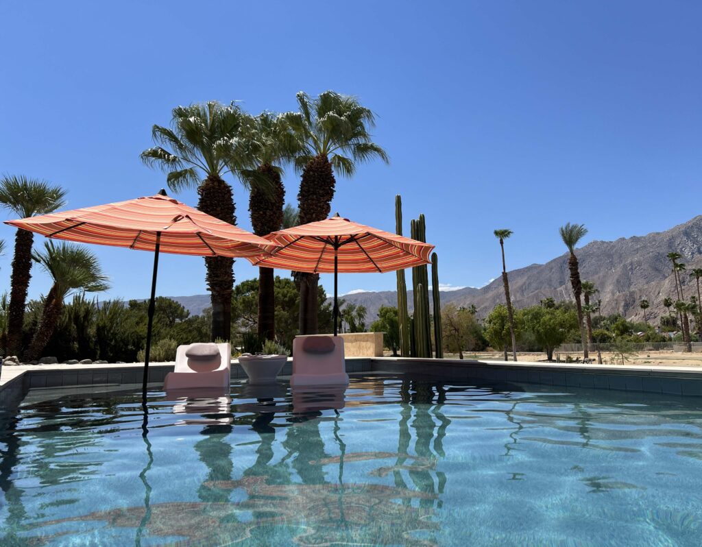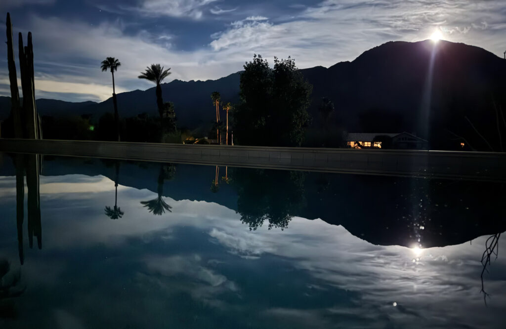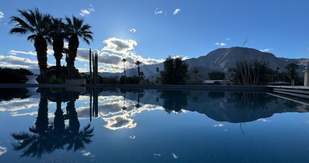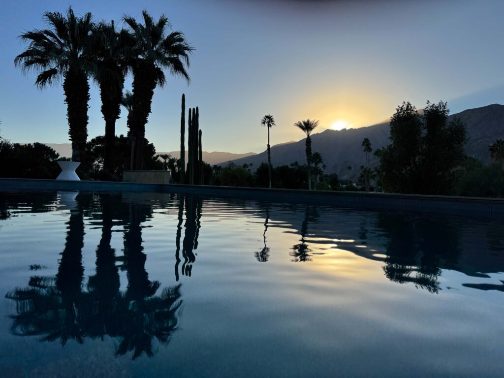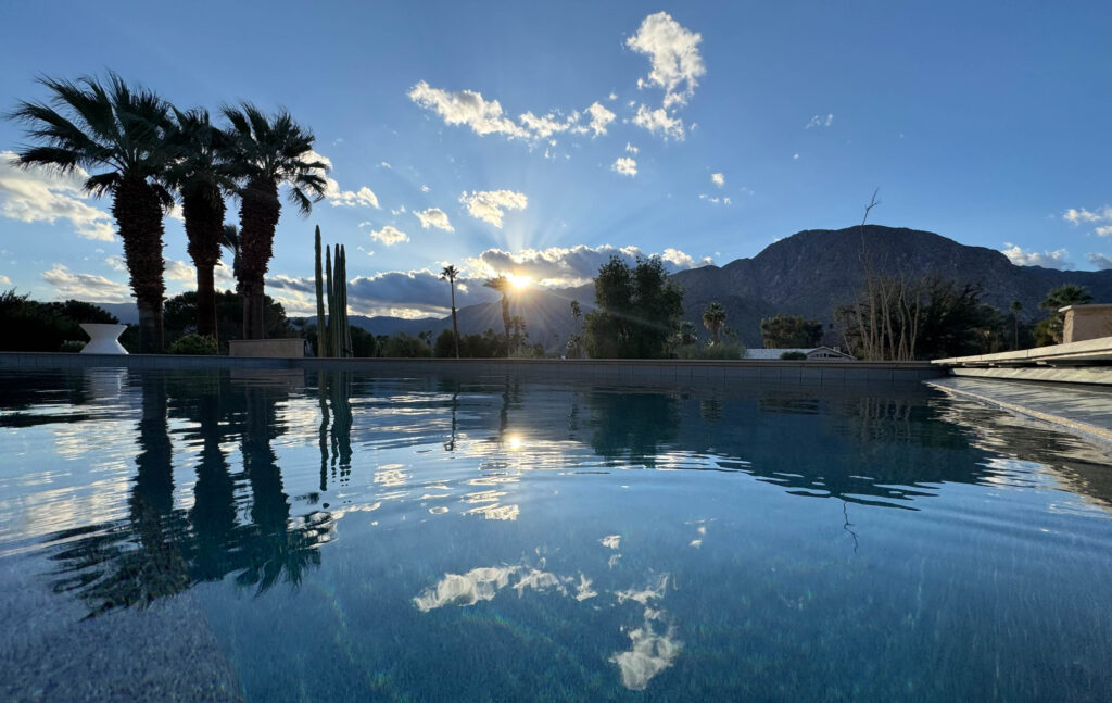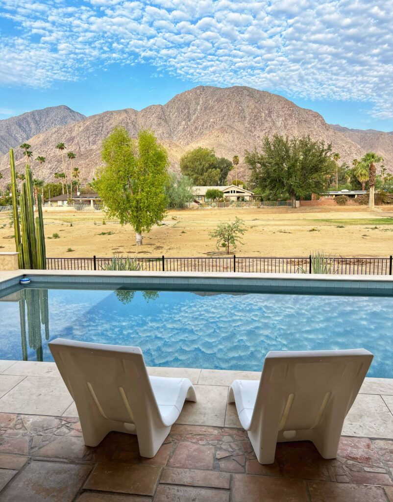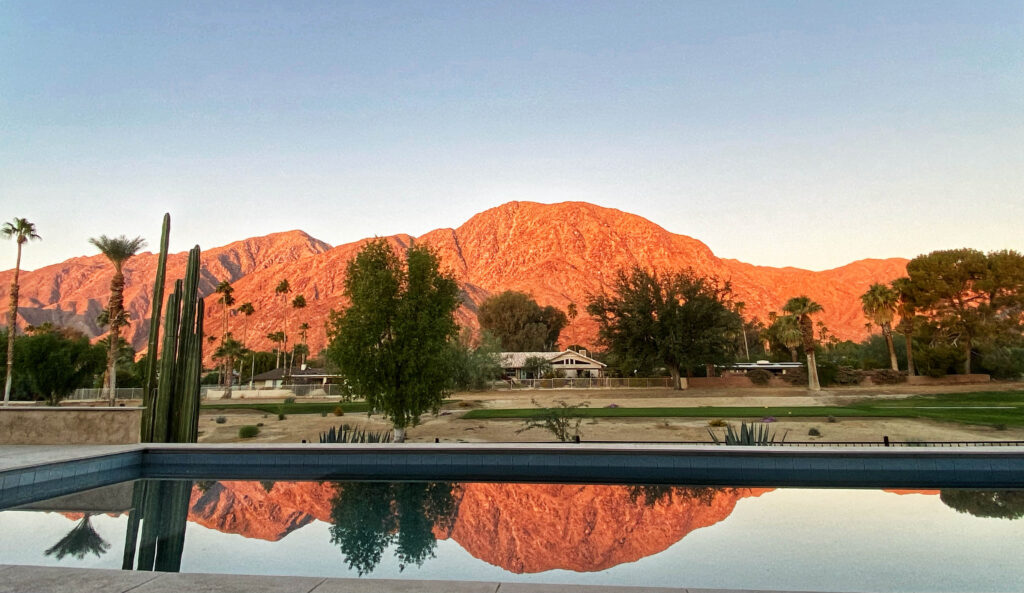 Floor to celiing window framing Indianhead Mountain, gold course and pool